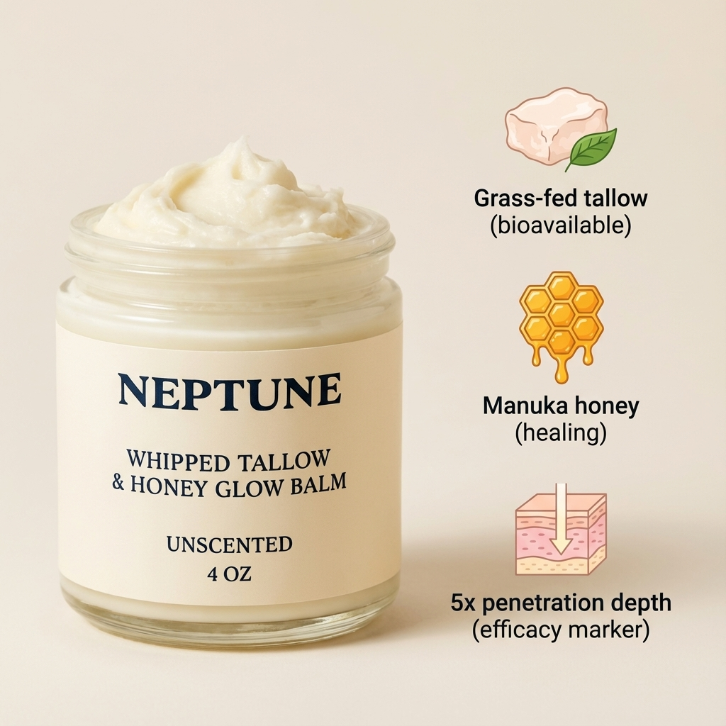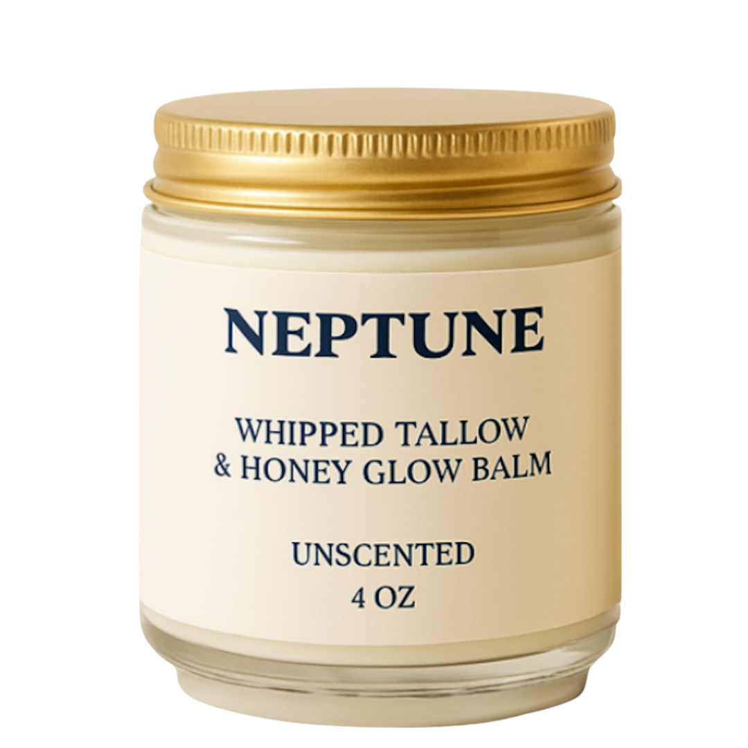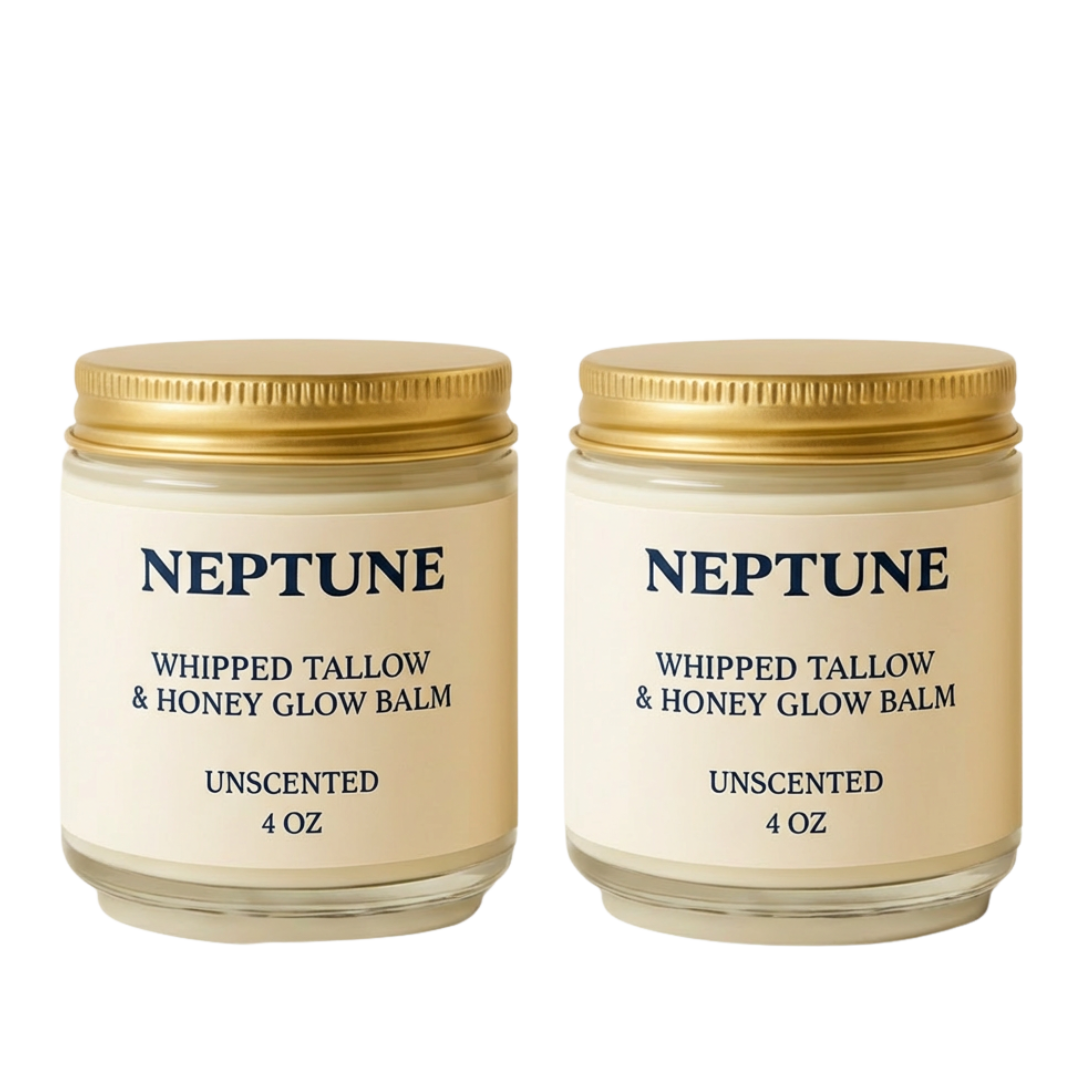 Neptune Whipped Tallow Balm is the same bioavailable formula—rendered grass-fed tallow, Manuka honey, the same clinical-grade ingredients. But now it's aerated into a light, fluffy texture that melts on contact. No warming. No tugging. Just skin nourishment that spreads like you've always wanted it to.