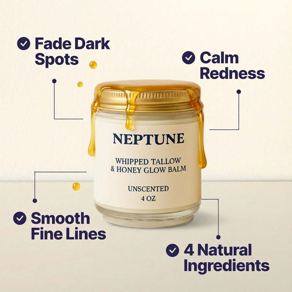 Comparison chart of Neptune's Tallow Balm versus other brands with benefits listed.Product review featuring Neptune Whipped Tallow & Honey Glow Balm with leaves and honeycomb background.Jar of Neptune Whipped Tallow & Honey Glow Balm with text about a money-back guarantee.
